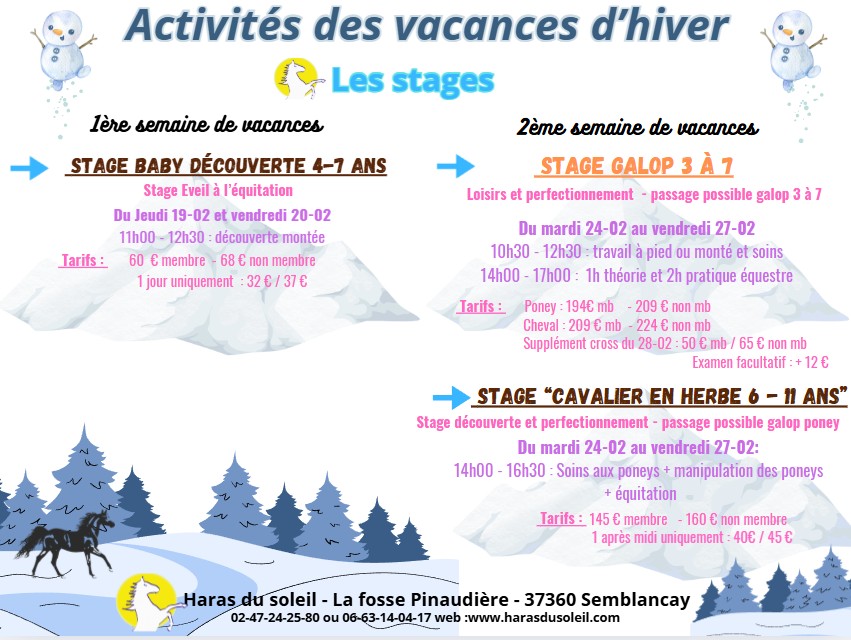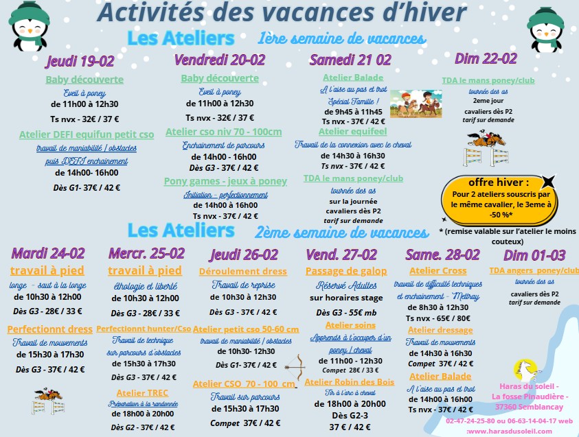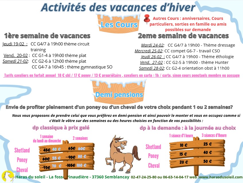 Ils sont programmés durant les vacances scolaires, et parfois sur le dimanche ou un jour férié. Sur une durée d'1h30 à 2h30, vous pourrez vous perfectionner en équitation classique (atelier cso, dressage ou cross) ou découvrir et apprendre d'autres activités (voltige, attelage, ballade,tir à l'arc..) Pour découvrir les thèmes et dates de nos prochains ateliers, ainsi que leur tarif sur les vacances de février 2026, cliquez ici, Vous pourrez également trouver les possibilités de cours ou demi pension durant cette période de vacances, cliquez ici pour y accéder |