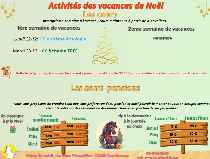 Ils sont programmés durant les vacances scolaires, et parfois sur le dimanche ou un jour férié. Sur une durée d'1h30 à 2h30, vous pourrez vous perfectionner en équitation classique (atelier cso, dressage ou cross) ou découvrir et apprendre d'autres activités (voltige, attelage, ballade,tir à l'arc..) Pour découvrir les thèmes et dates de nos prochains ateliers, ainsi que leur tarif sur les vacances de Noel 2025, cliquez ici, Vous pourrez également trouver les possibilités de cours ou demi pension durant cette période de vacances, cliquez ici pour y accéder |