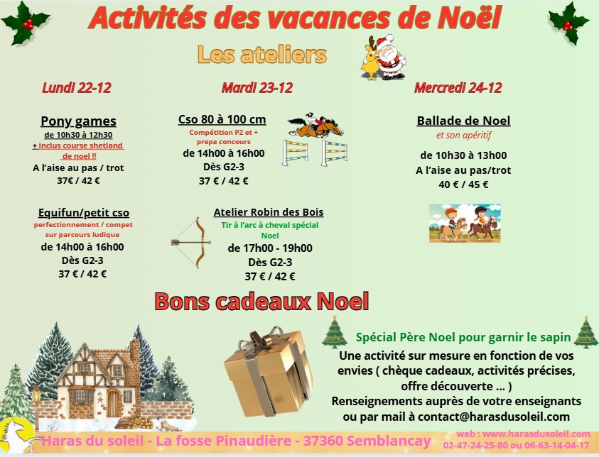 Ils sont programmés durant les vacances scolaires, et parfois sur le dimanche ou un jour férié. Sur une durée d'1h30 à 2h30, vous pourrez vous perfectionner en équitation classique (atelier cso, dressage ou cross) ou découvrir et apprendre d'autres activités (voltige, attelage, ballade,tir à l'arc..) Pour découvrir les thèmes et dates de nos prochains ateliers, ainsi que leur tarif sur les vacances de Noel 2025, cliquez ici, Vous pourrez également trouver les possibilités de cours ou demi pension durant cette période de vacances, cliquez ici pour y accéder |